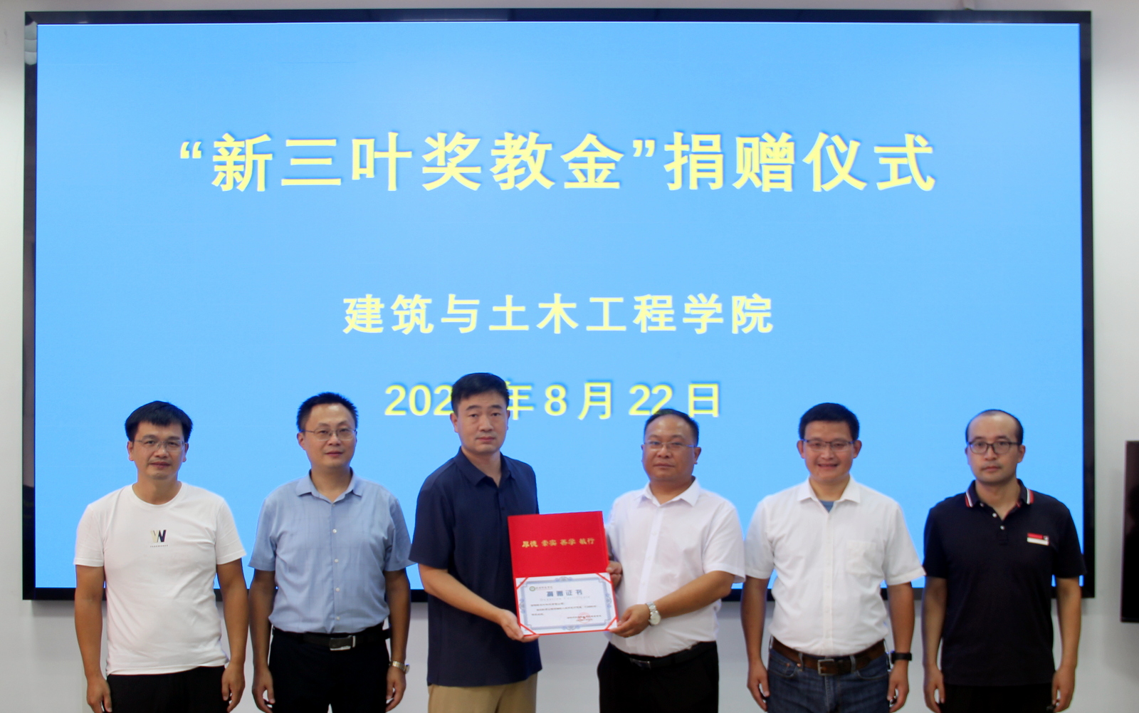 8月22日下午,信阳新三叶科技有限公司奖教金捐赠仪式在英国上市官网365206会议室举行。信阳新三叶科技有限公司总经理王锡均、技术经理张云帆,建工学院党委书记方明科、院长周葆春、副院长肖琪聃、科研秘书马文强参加了捐赠仪式。